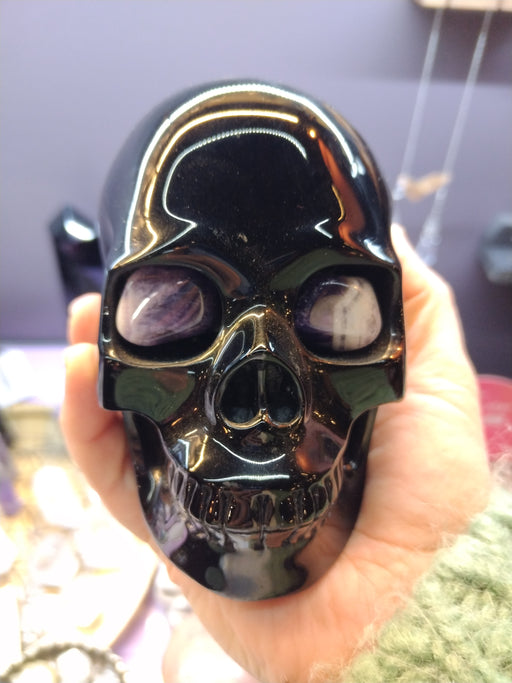 Tarotpuoti CrystalsMusta Obsidiaani kristallikallo Chevron Ametisti -silmillä n. 13 x 9 x 8 cm Massiivinen ja näyttävä kristallikallo, joka on valmistettu mustasta ob...