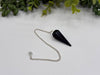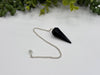 Tässä tyylikkäässä heilurissa on mustasta obsidiaanista valmistettu kärkiosa, hopeoitu metalliketju ja ketjun päässä kirkas vuorikristallipallo. Kiven pituus on noin 4 cm, ja jokainen kappale on aitoa luonnonkiveä.