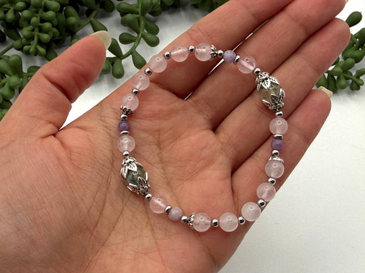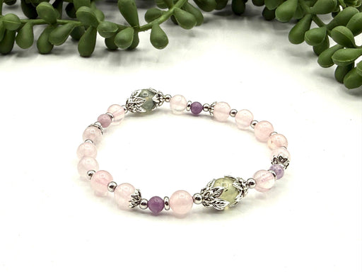 Vollständige Details anzeigenLOVE MYSELF – Prehniitti, ruusukvartsi ja lepidoliittirannekoru