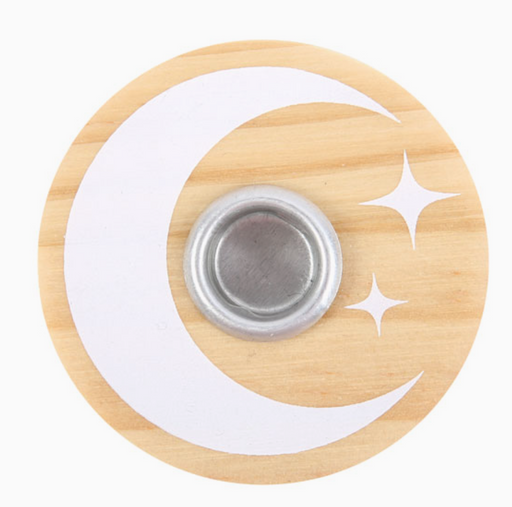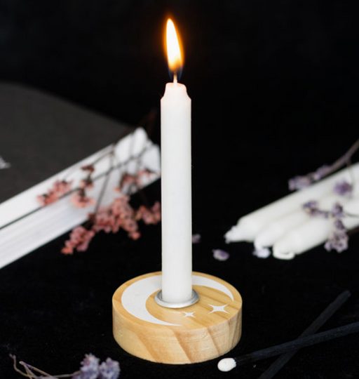 Puunvärinen kynttilänjalka loitsukynttilöille, suunniteltu noin 1 cm halkaisijaltaan oleville kynttilöille. Pyöreässä kiekossa on koristeena valkoi...