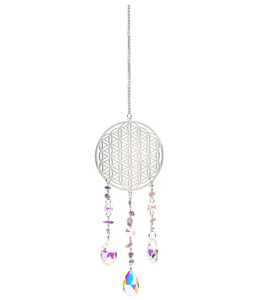 Flower of Life -aurinkosieppari – ametisti & kristalliriipus Hopeansävyinen aurinkosieppari, jossa elämän kukan symboli ja koristeena pieniä am...