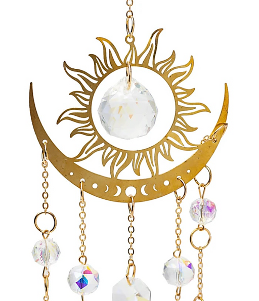 Tarotpuoti ImportAurinko & puolikuu -aurinkosieppari – kristallilasiriipuksella Koristeellinen aurinkosieppari, jossa kultasävyisestä metallista leikattu auring...