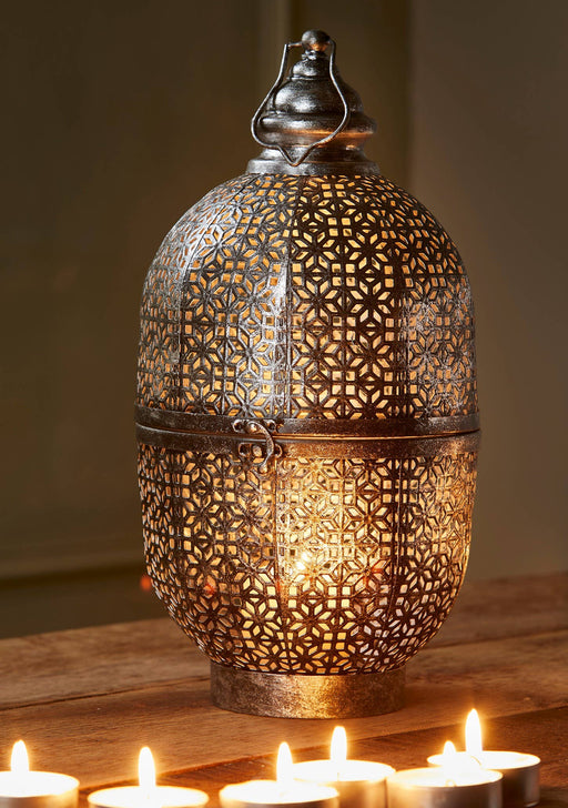 Taropuoti ImportsNäyttävä kyyneleenmuotoinen metallilyhty, jossa harmaa-kultainen viimeistely ja kauniisti leikattu kuviointi. Kynttilän valo heijastuu lyhdyn läpi ...