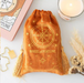 Samettinen nyöripussi, jossa on kaunis tarotkorttiaiheinen painatus. Saatavilla neljä eri mallia: The Sun (vaaleanpunainen), The Moon (petroolinvihreä), The Wheel of Fortune (beige) ja The Star (sininen). Sopii erinomaisesti tarotkorttien, kristallien tai muiden pienten esineiden säilyttämiseen ja kuljettamiseen.