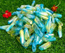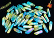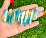 Nämä kauniisti hohtavat aura aqua -kvartsikiteet säteilevät kirkkaan sinisen ja kullankeltaisen sävyissä, joiden väliin muodostuu upeita vihertäviä ja sateenkaarenkaltaisia vivahteita. Jokainen kide on ainutlaatuinen ja kiillotettu korostamaan sen valoa heijastavaa pintaa. Kivet myydään yksittäin.